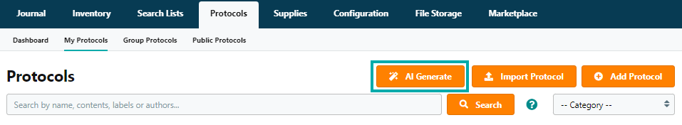 To generate a new protocol navigate to the My Protocols page under the Protocols tab and click the AI Generate button.