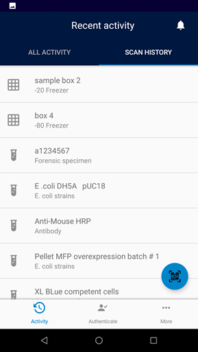 The Scan History shows a list of last scanned samples, devices and compartments. Press one off these items to view the item information.
