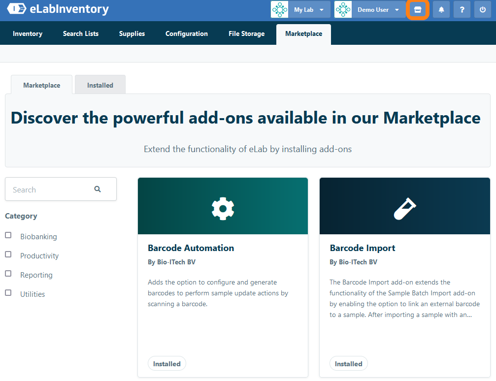 The eLabInventory offers a Marketplace with a wide range of powerful add-ons that can be installed to extend the functionality of the eLabInventory. Navigate to Marketplace to see a list of add-ons are available.