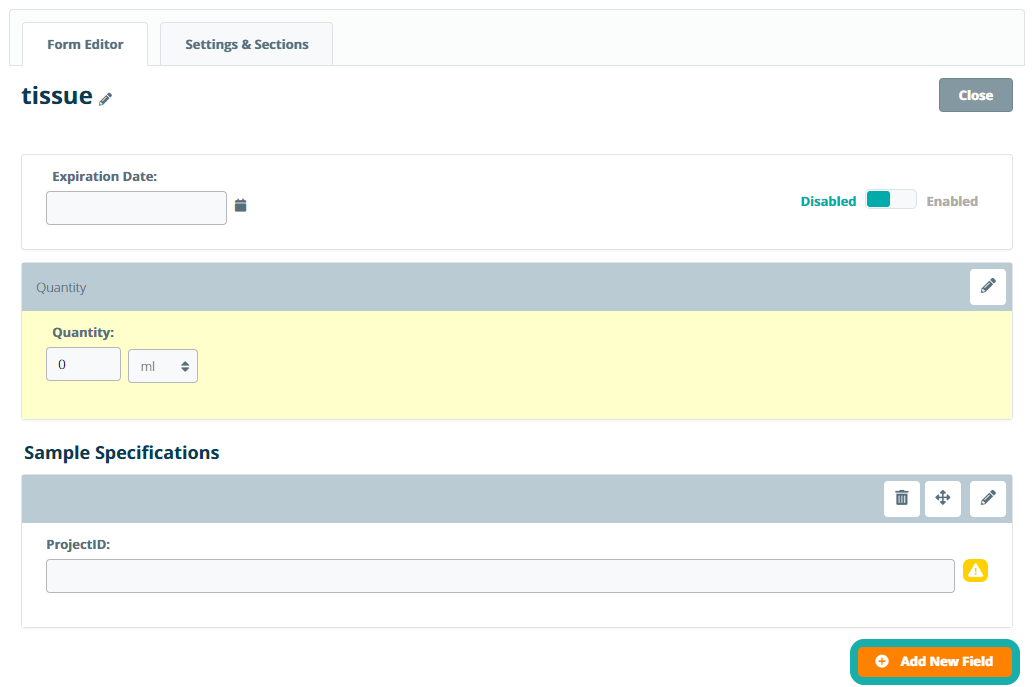When adding a custom sample type, it contains 4 fields by default including the Sample Name, Description, Storage Location and a Notes field. If your lab has the Supplies module activated, then the Quantity field will also be available. You can further customize the sample type by adding specification fields to the sample type template. To add a custom specification field, click Add New Field. Note: if you created a sample type using one of the predefined templates in the system, you can customize it by removing or adding fields.