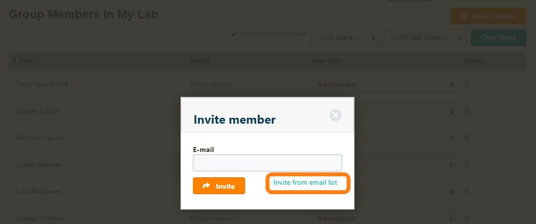 When a large number of users need to be added to the lab (ex. when first setting up the lab or when preparing practical classes), you can invite multiple users from an email list. Within the Invite Member window, click the Invite from email list link to expand the input field.