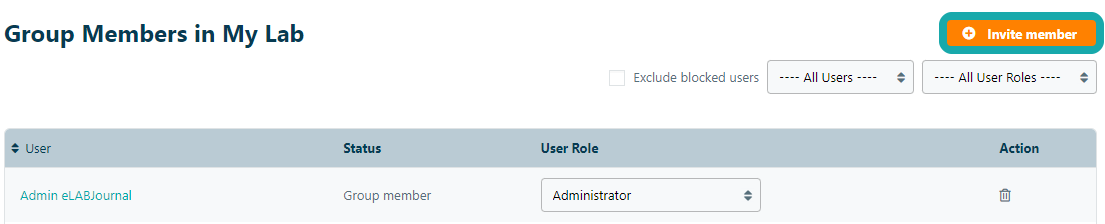 To add a user to your lab, you can send an invitation to your colleague. Navigate to Groups and click Manage Members. Alternatively, you can also manage group members by navigating to Group Members in the Configuration menu.
