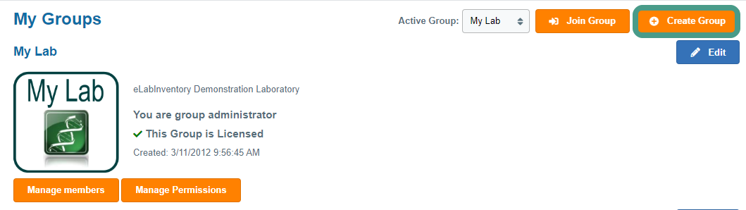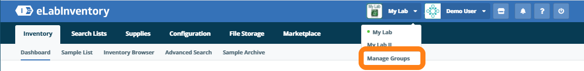 If your lab is new to any of our applications, your first step should be to set up a group where you can share data with other co-workers in your organization. Navigate to Manage Groups.