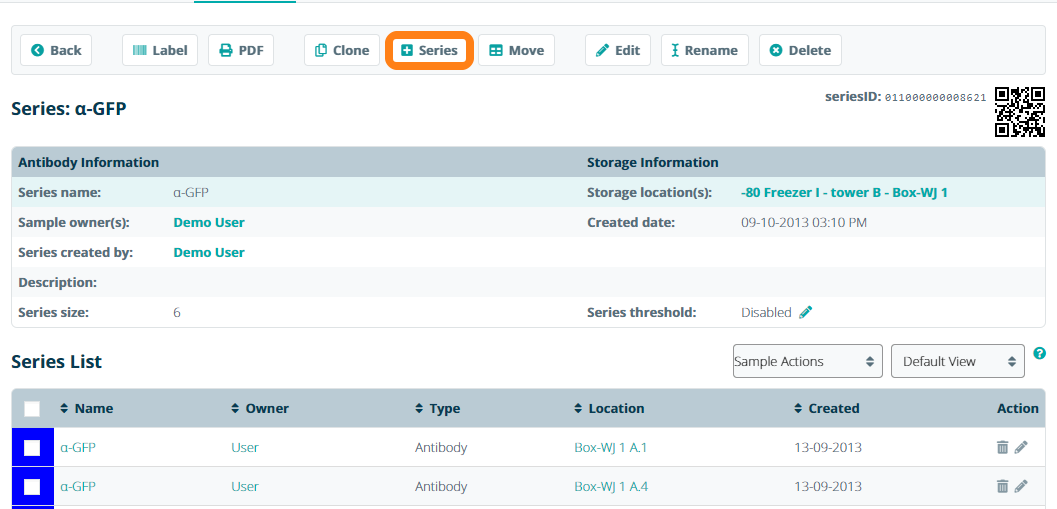 To add samples to an existing series, open the information sheet of the sample series to which you want to add the samples. Click the Series button to add additional samples to the series.