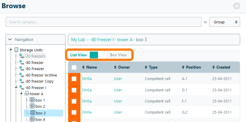 In the pop-up window, find and select the samples you want to add from the Inventory Browser. Multiple samples can be selected from a storage layer by marking the checkboxes from the list (note: boxes need to be toggled to List View first). Once the samples have been selected, click Choose these samples.