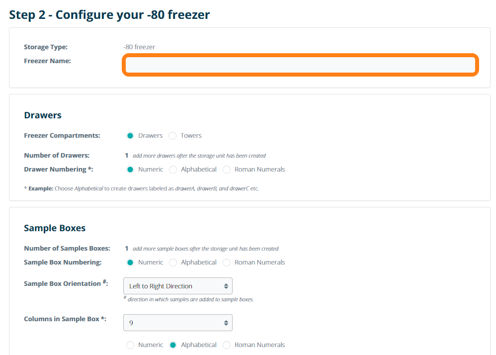 After selecting the desired storage type, you can continue configuring the storage unit in Step 2. Enter a Name and choose which compartments you want to add. For instance, a -80 freezer offers the option to add towers or drawers and choose the box dimensions. You can also set the compartment numbering setting, which is used to automatically number boxes when they are added to the freezer. Note: only one compartment is added to a storage unit during the configuration phase. Users can add additional compartments via the Inventory Browser once configuration is complete. Click Proceed to apply these settings.