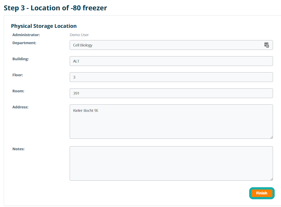 In Step 3, you can enter the physical location of the storage unit by defining the department, building, floor and room where it is located. Click Finish to complete configuration and create the storage unit.