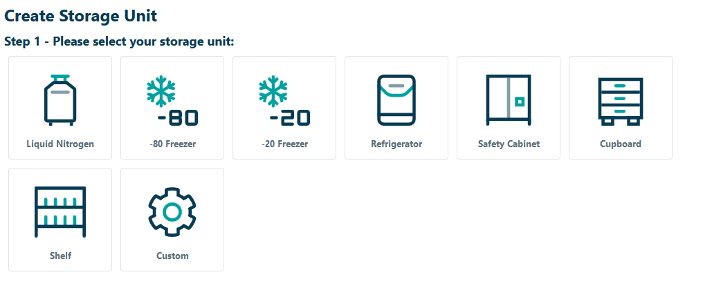 In Step 1 of the creation process, choose what type of storage unit you want to add by clicking the corresponding icon. Users can either select one of the predefined template - Liquid nitrogen, -80 Freezer, -20 Freezer, Refrigerator, Safety Cabinet, Cupboard, Shelf - or define a Custom storage unit.