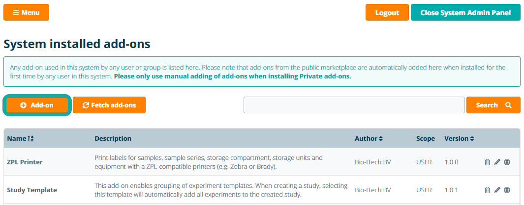 In an eLabInventory Private Cloud or On-Premises installation you can only install add-ons that are available for your system (e.g. private add-ons). Installing an add-on will ensure it only becomes available in the Marketplace for your system, groups or users in your system installation. In case you have developed an add-on that might be of interest for public use, please contact us for more information on how to submit your add-on to the public Marketplace.