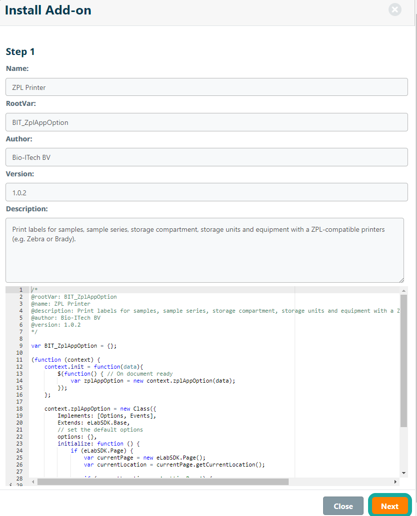 In the first step of the add-on installation process, all add-on properties are extracted and the add-on code is validated. Click Next to proceed