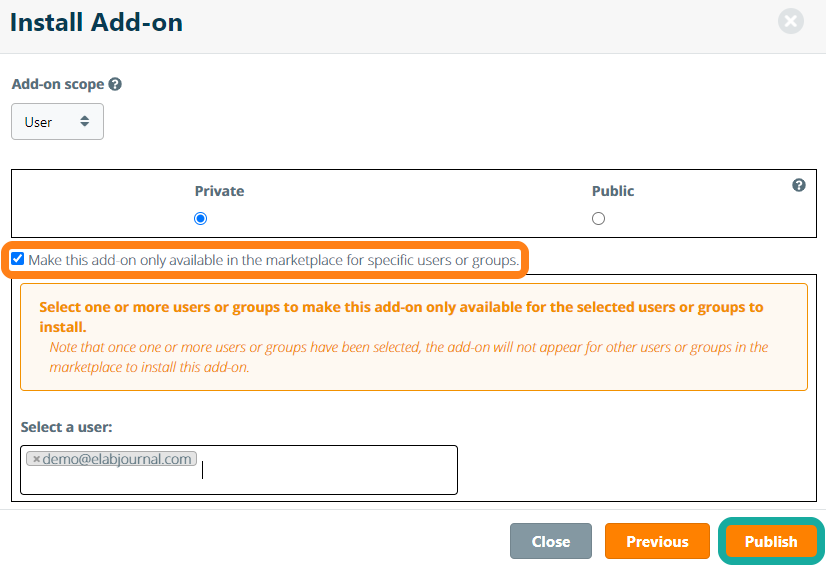 Depending on the selected scope, you can optionally select specific organisations, groups or users for which the add-on should be made available in the Marketplace only. Please note that when adding the add-on for a specific organisation, group or user, the add-on will not be made available in the Marketplace for other organisations, groups or users.