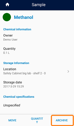 While working in the lab, one of the samples or sample series is used up, you can archive samples using your mobile device. To do so, scan the barcode of a sample and choose Archive.