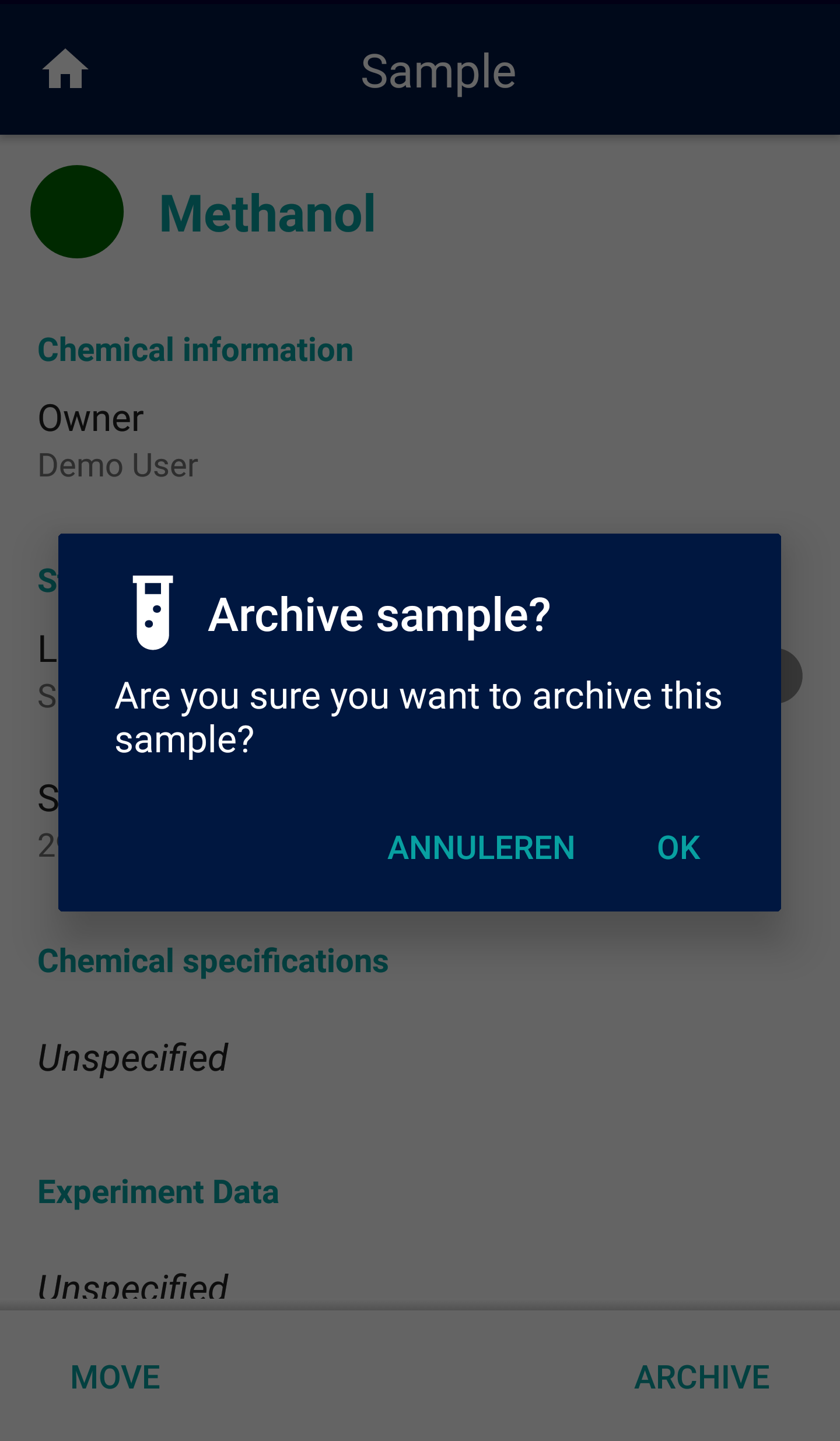 Confirm the archiving of the sample. The removed sample will automatically be placed in the sample archive. This way the full sample audit trail will be accessible in the system, restoring samples from the sample archive can be done using the web app.