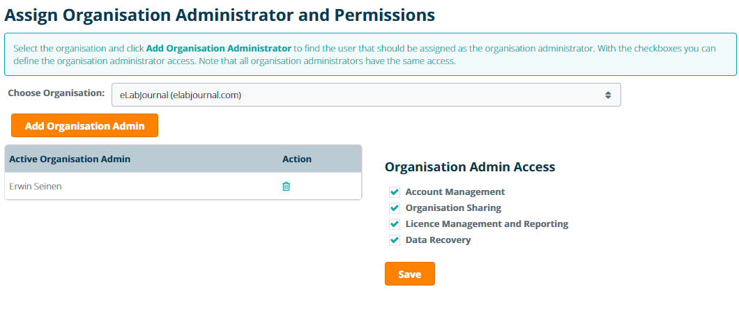 To be able to delegate system maintenance tasks to other users in the system, such as user management, license reporting, organisation sharing and data recovery, without providing them full system control, eLabInventory offers the option to assign an Organisation Administrator.