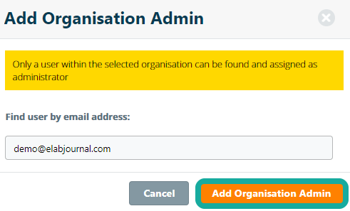 Find user by email address in the appeared window and click Add Organisation Admin. Once an organisation admin is added, you can define which tabs are available for the organisation admin by setting the Organisation Admin Access. Note that only users from within the organisation can be assigned.