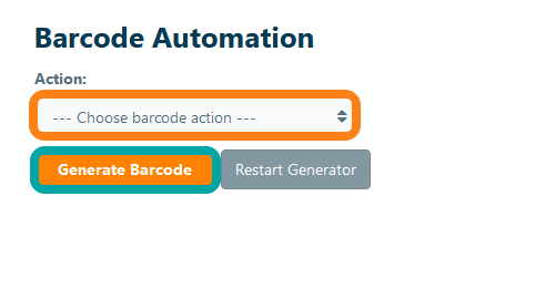 To create a barcode, select the Action in the drop down menu and click Generate to get the barcode.