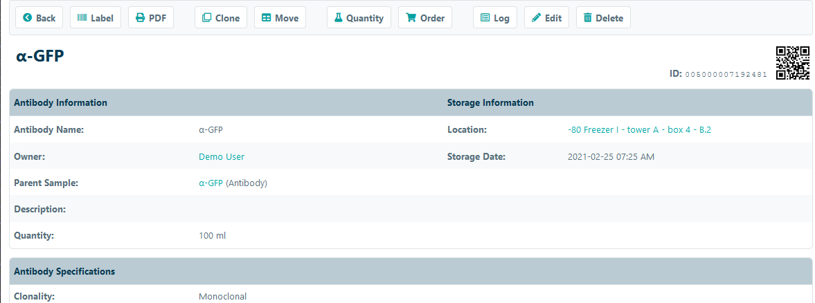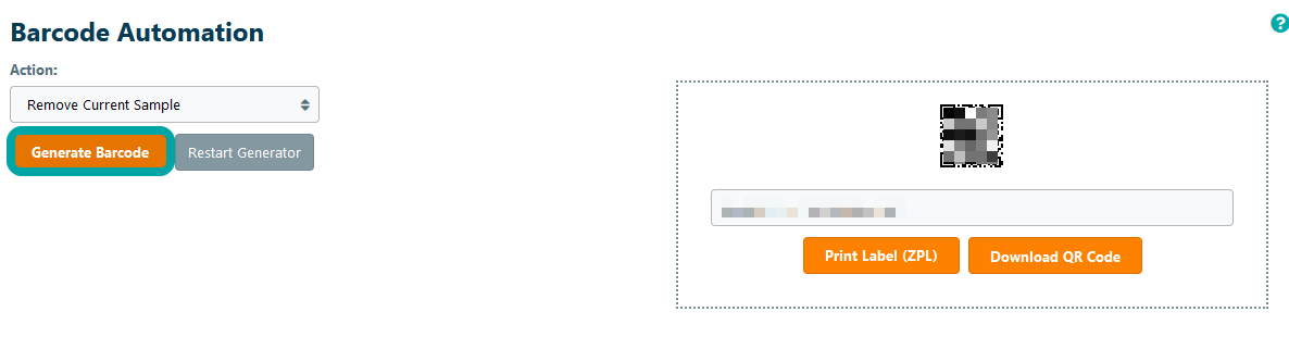 The barcode can be printed using a ZPL Printer or Downloaded. After this is done, you can navigate to the desired sample to perform the action, either by first navigating to the sample or by scanning the sample barcode. Once the sample information sheet is displayed, you can scan the action barcode.