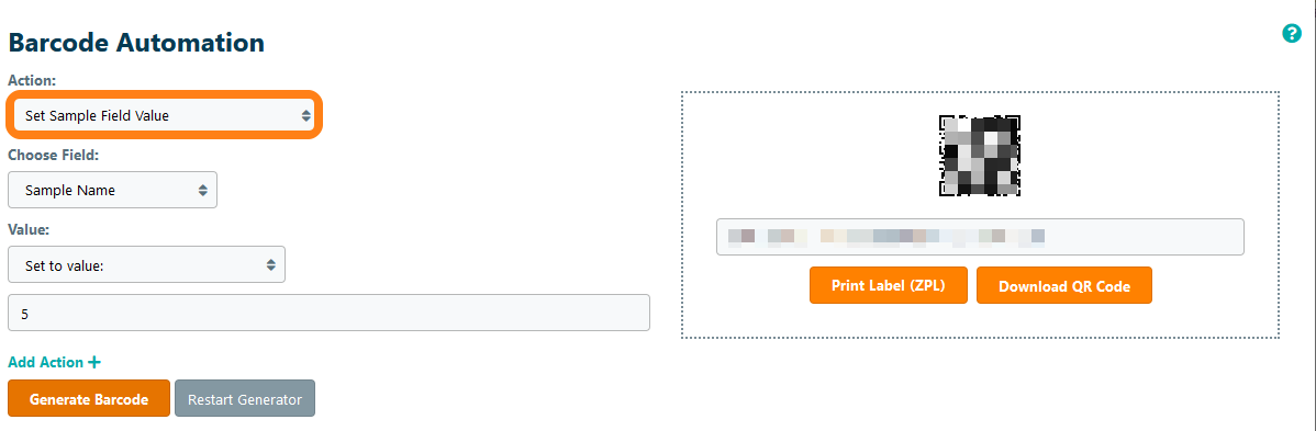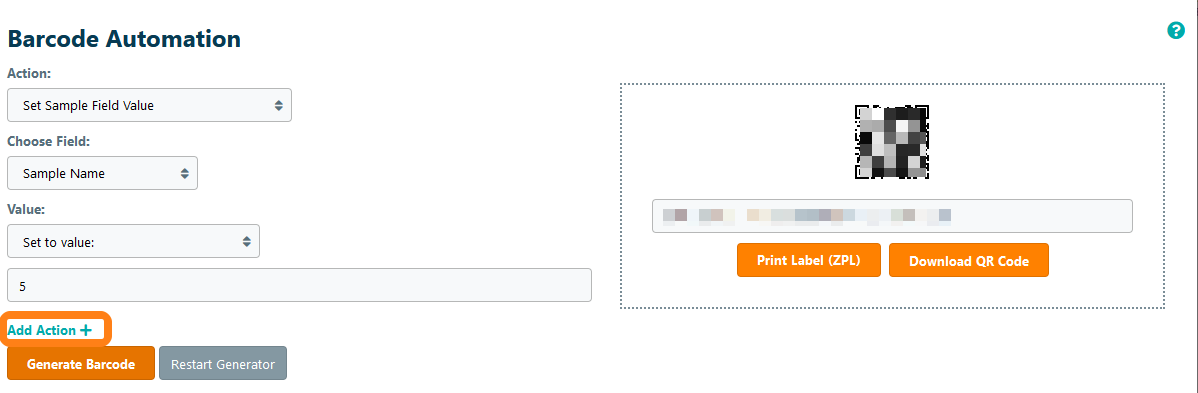 If one of the supported fields is selected the option 'Add Action +' will become available. When configuring a barcode that can perform multiple actions you can update multiple sample properties in a single barcode scan or clear a sample quantity and archive the sample in a scan single action. Chaining barcodes is also supported when updating multiple samples by performing a scan action.