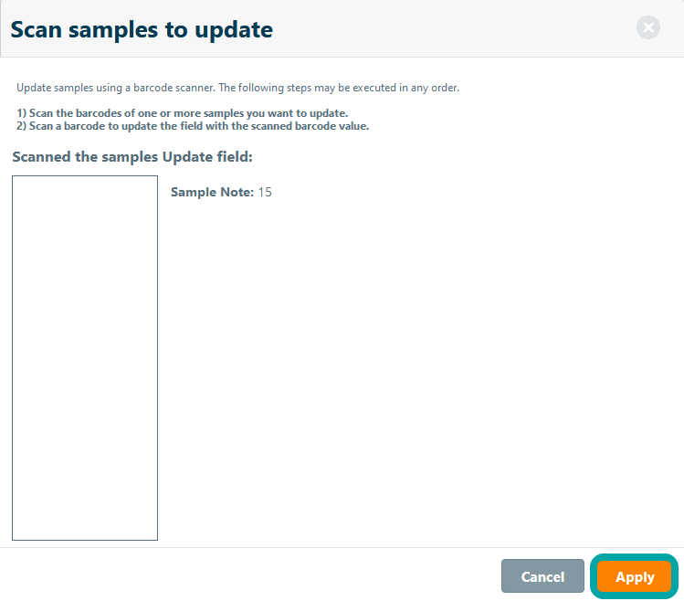 When scanning the generated barcode, a pop-up menu will appear allowing you to scan samples that should be updated with the chosen value during the barcode configuration.