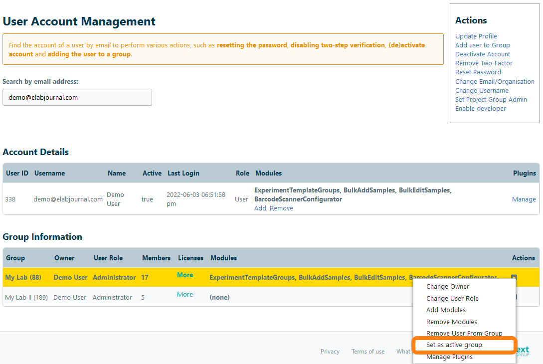 To change the active group for a user thereby changing the group where the user is working in, navigate to Accounts in the System Admin Panel panel and open Mange Accounts. Find the current group using the email address. Open the actions menu of the group and choose Set as active group.