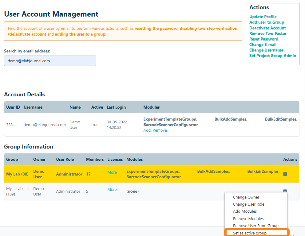 Choose Set active group to change the active group for this user.