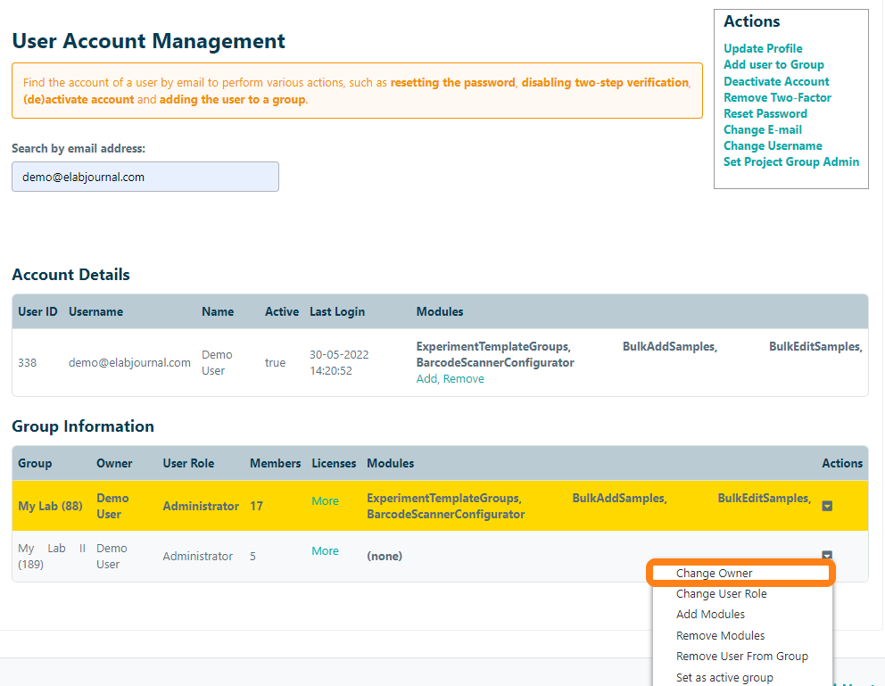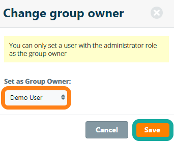 To change the group owner or group administrator, navigate to the Organisation Admin panel and open Manage Accounts. Find the current group owner by email address. Open the actions menu of the Group Information and click the Change Owner option in the actions menu.