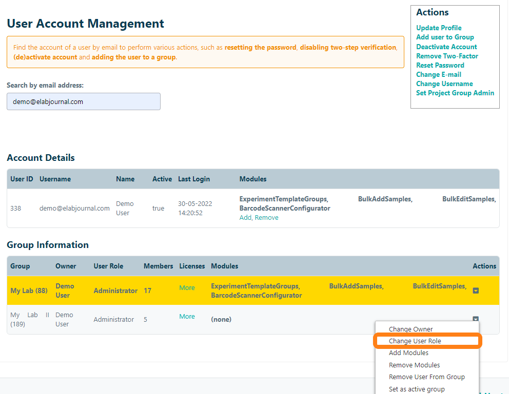 To change the user role in a group, navigate to the Organisation Admin panel and open Manage Accounts. Find the user by email address. Open the actions menu of the Group Information and click the Change User Role option in the actions menu.
