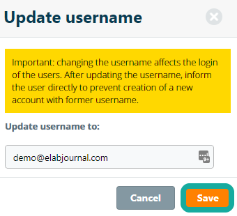 Please be aware that changing the username in the system has major consequences. To avoid confusion for a user during the login (i.e. forgot the username), the default setting of the system is that during the account set-up or account registration, the username is set to the user email address. In case the organisation login with AD/LDAP/ADFS/SSO is used, the username and email address are automatically set and updated during each login procedure. In case of user of federated login, the username should never be updated