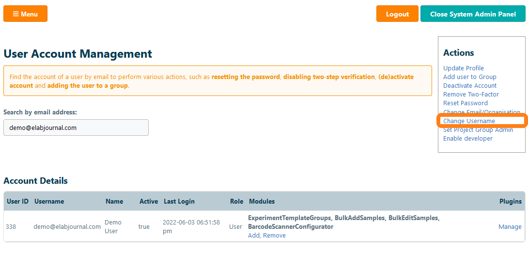 To change the user name for an account, navigate to Manage Accounts in the System Admin Panel. Find the account by entering the email address and click Change Username.
