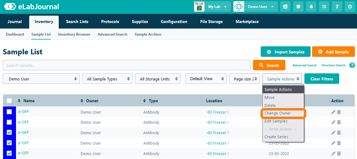 Each sample stored in the system has a sample owner, who must be an active user in the lab. If you want to change the owner of a sample, navigate to the Sample List page and mark the checkbox of the sample that you want to transfer to another owner. Open the Sample Actions dropdown and select Change Owner.