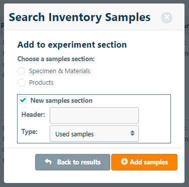 The system will identify pre-existing sample sections in the experiment and let you select where to add the sample. If a sample section does not exist yet, or if you want to create a new sample section, you can select the New samples section option and click Add samples button to expand the window and set the header and section type. When clicking Add samples will add the sample to the selected section option.
