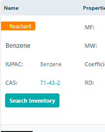 The reaction table contains a combination of information that is either automatically generated or input directly by the user. Naming and Properties are filled in automatically and are pulled from the PubChem API into eLabInventory (Name, IUPAC, CAS, MF, MW, RD fields).