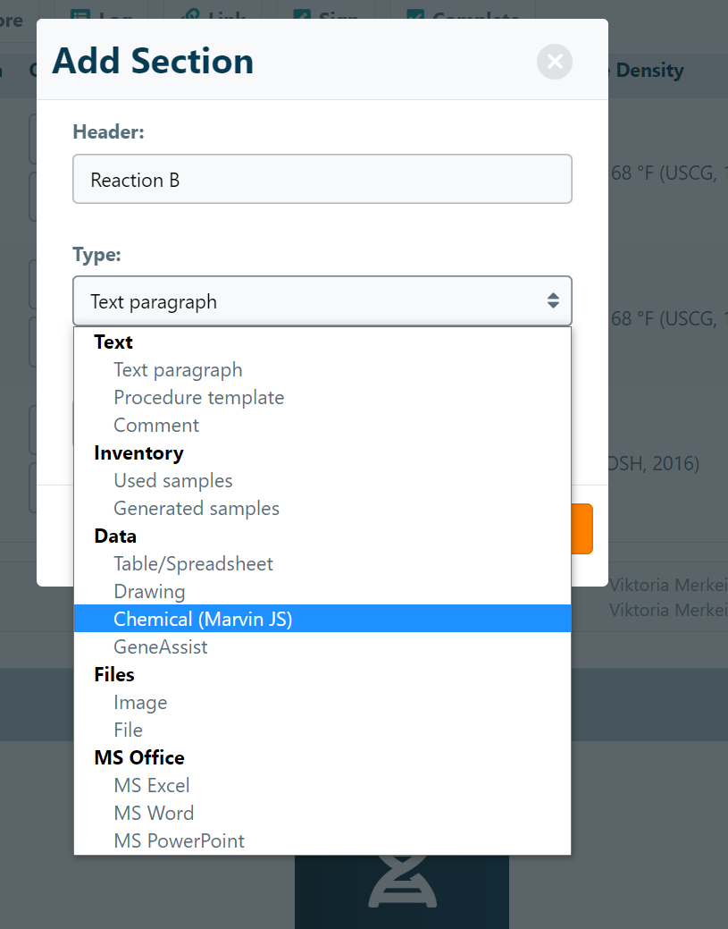 ChemAssist expands on the existing functionality of the MarvinJS add-on by adding reaction tables and analysis tools to chemical sections within the ELN. To create a chemical section within an experiment, click the Add New Section at the bottom of the experiment page and select the section type “Chemical”.