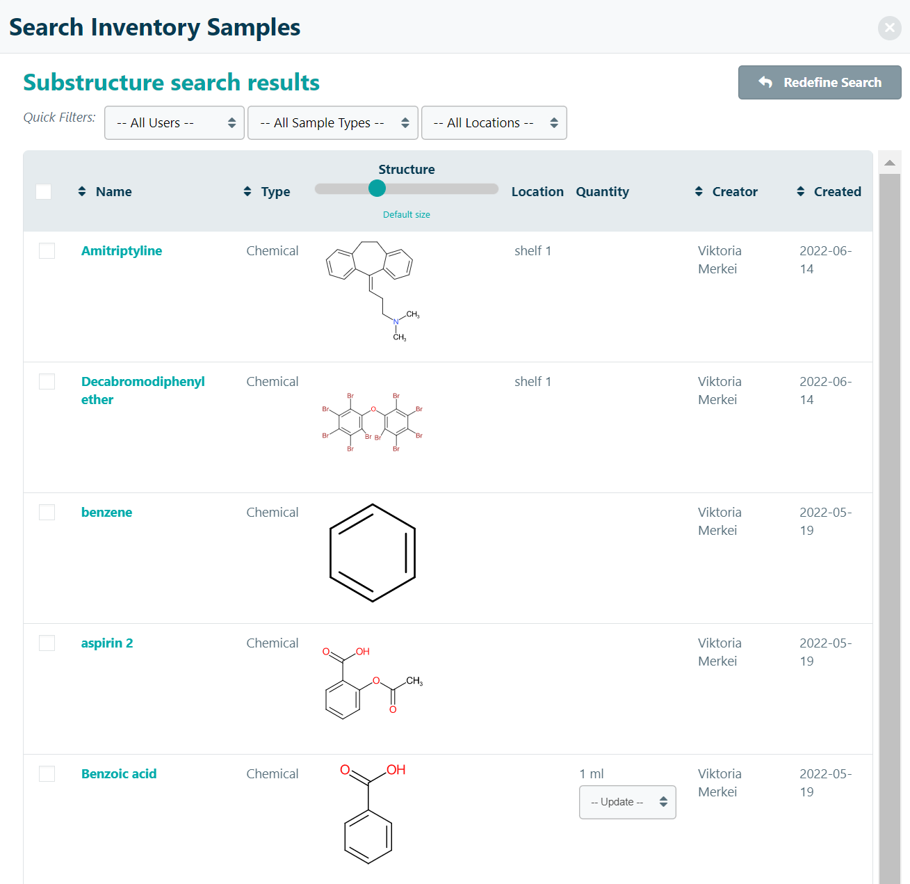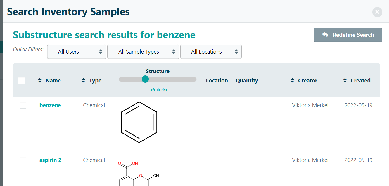 You can search for corresponding reactants or products in their Inventory and add them to a sample section within the experiment. Click on Search Inventory and then define the search parameters.