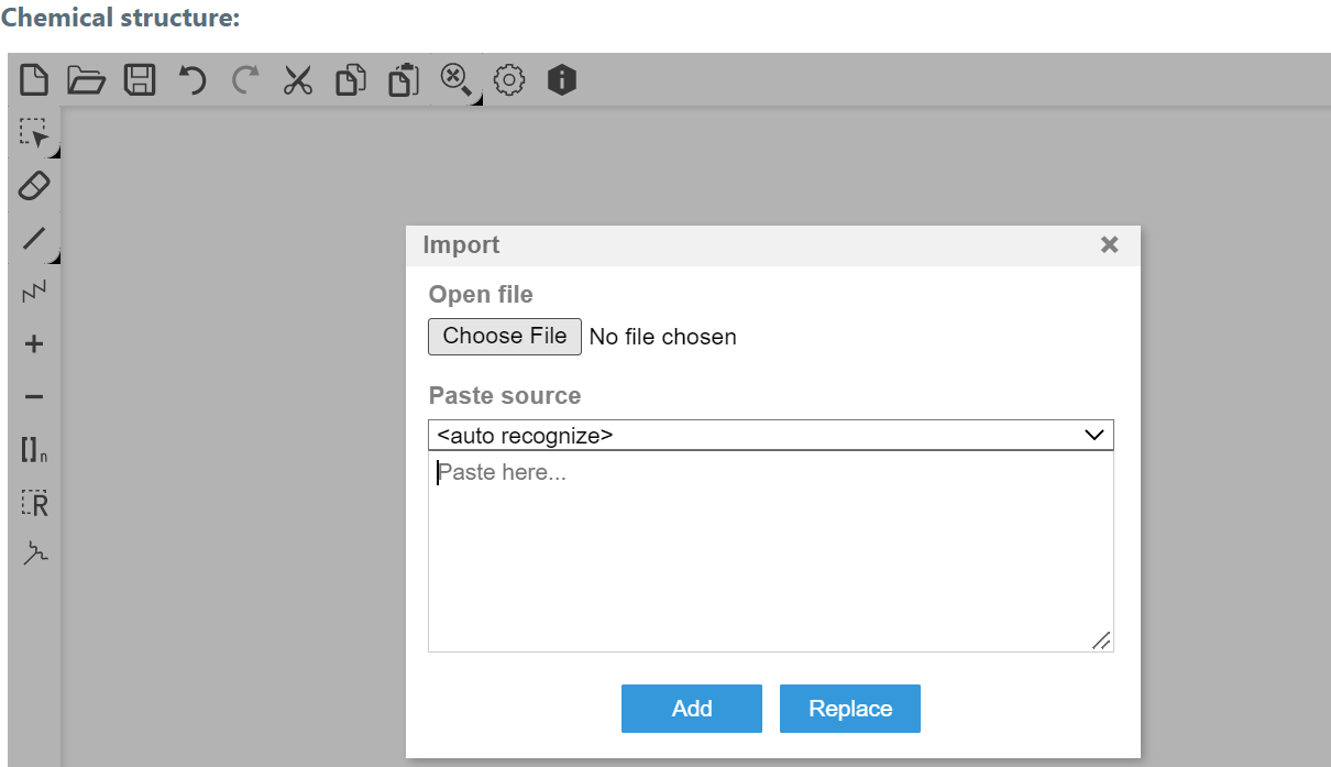 FAQ Note: the most common molecules mol files can be downloaded from the internet, which can be imported as a base structure of a new molecule and then modified. In the case of more complex structures, the structure can be drawn once, exported as a mol file, and then reimported into eLab to create new variations. Copy-pasting a drawn structure into a new window is currently not supported