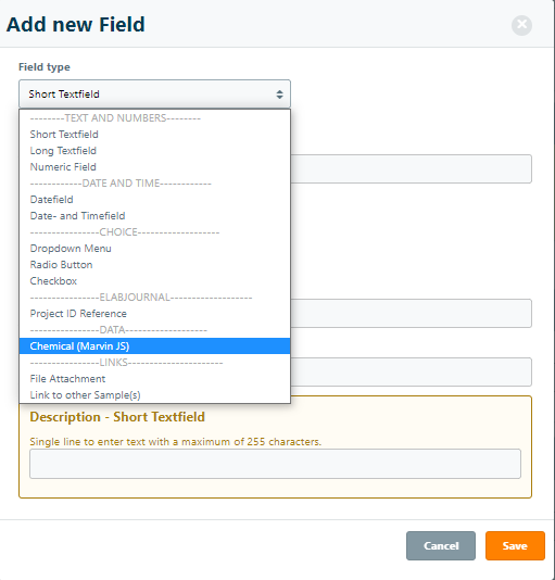 ChemAssist introduces a new sample field option called Chemical structure that can be added to a sample type template. Note: this functionality needs to be activated within the add-on Configuration: by activating Enable MarvinJS chemical structure as field type in Sample Types.