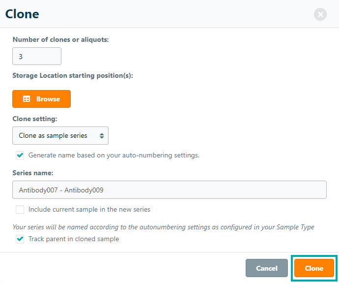 - Generate name based on your auto-numbering settings - applies the auto-numbering setting from existing sample's type to the cloned sample (Note: users must first activate this option in the sample type's Settings page)
