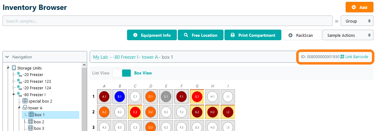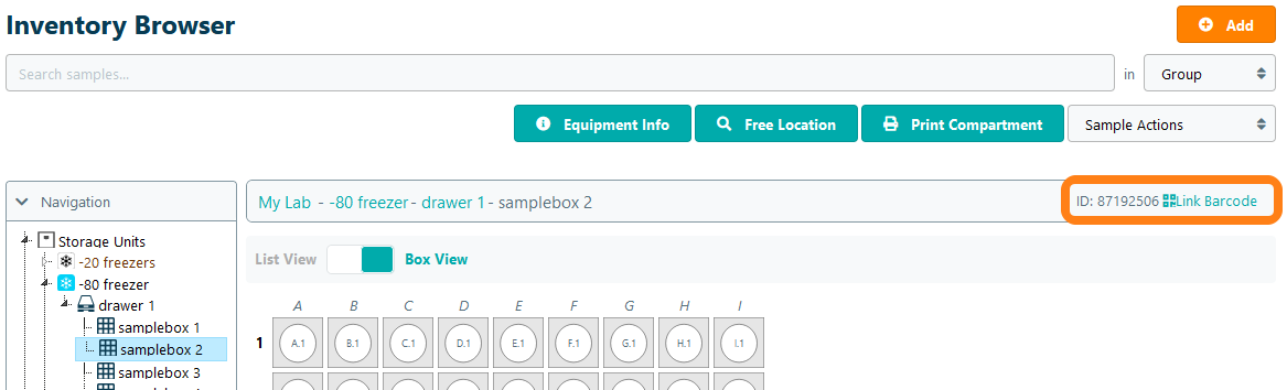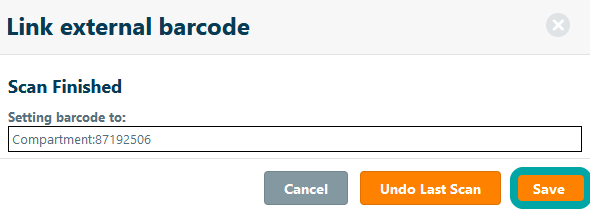 After installing the add-on the default barcode for each compartment is shown, click on the new Link Barcode button to add your own custom barcode to this compartment