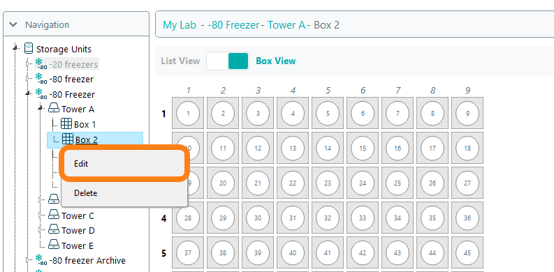 To change a box's orientation within the Inventory Browser, right-click on a box in either the navigation tree or the compartment panel and select Edit.