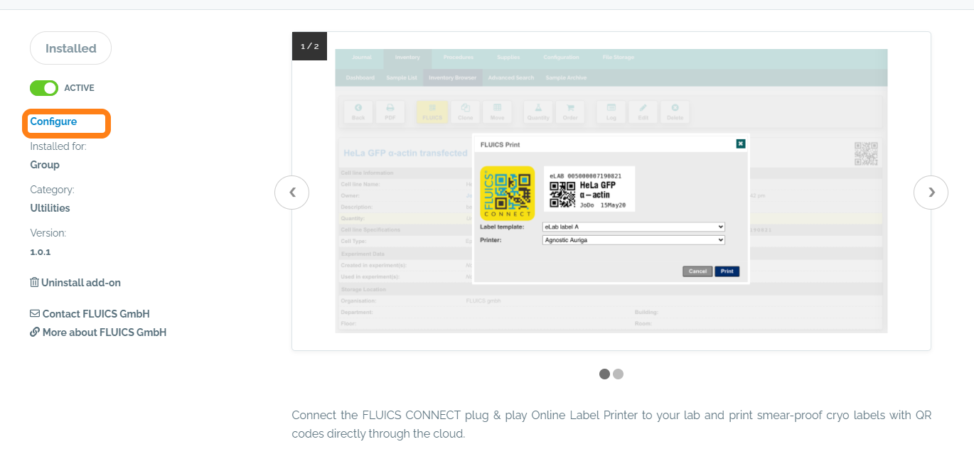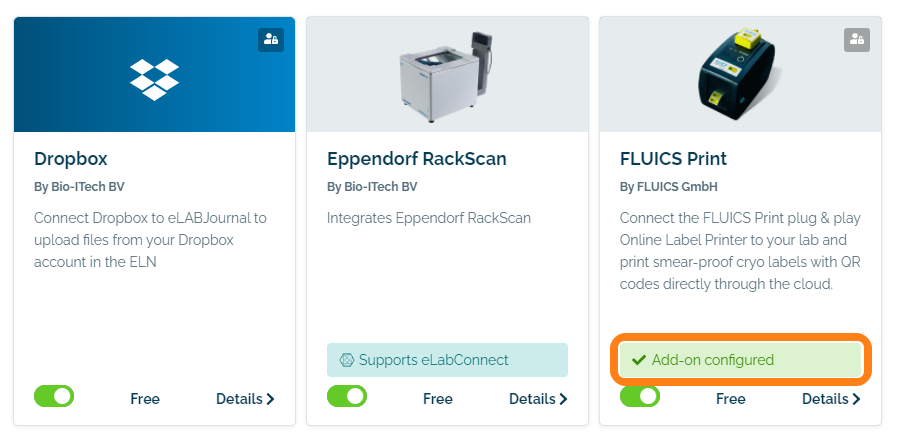 In the pop-up dialogue, you can set the configuration of the add-on. Once the add-on has been configured, the add-on will be highlighted accordingly. Please note that this label does not specify whether the add-on has been correctly configured, it only indicates that configuration options have been adjusted from their default setting.