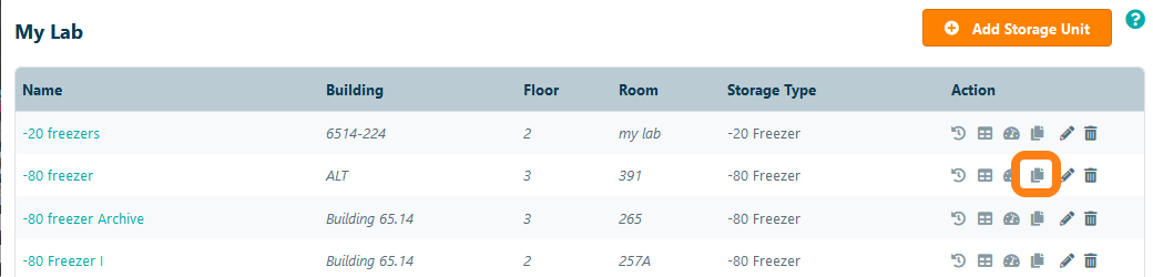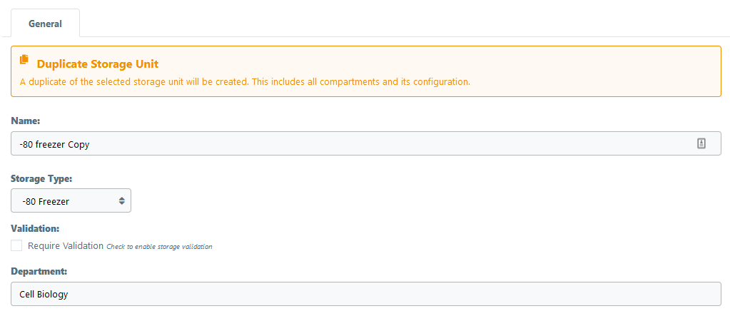 A duplicate of this selected storage unit will be created. This includes all compartments and its configuration. This does not include the samples stored in this storage unit.
