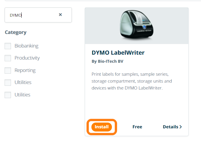 To enable printing of barcode labels with a DYMO LabelWriter© in eLabInventory, install the DYMO LabelWriter add-on from the Marketplace.