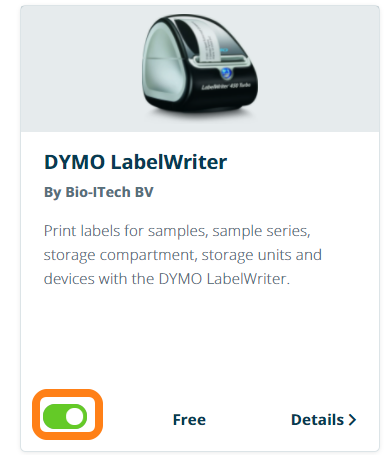 If you successfully printed a label, your printer has been correctly set-up and you can activate the DYMO LabelWriter for your eLabInventory account. Make sure that under installed add-ons in the Marketplace the DYMO LabelWriter add-on is installed and active.