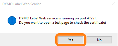 If this message is not shown, the DYMO LabelWriter© is unable to print labels from the browser. In that case, it is very likely that the IT department blocked port 41951-41960 (default port range for printing). Contact your IT department to open up this port or request an alternative port to allow communication from a web browser to the DYMO LabelWriter©.