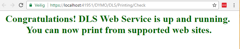 - Your browser will open and confirm that the following message is shown: Congratulations! DLS Web Service is up and running. You can now print from supported web sites: Note that his link will be opened in your default browser which may be a different browser you are using to print labels. Make sure to also open this link in the browser you are working in with eLabInventory by opening this link https://127.0.0.1:41951/DYMO/DLS/Printing/Check