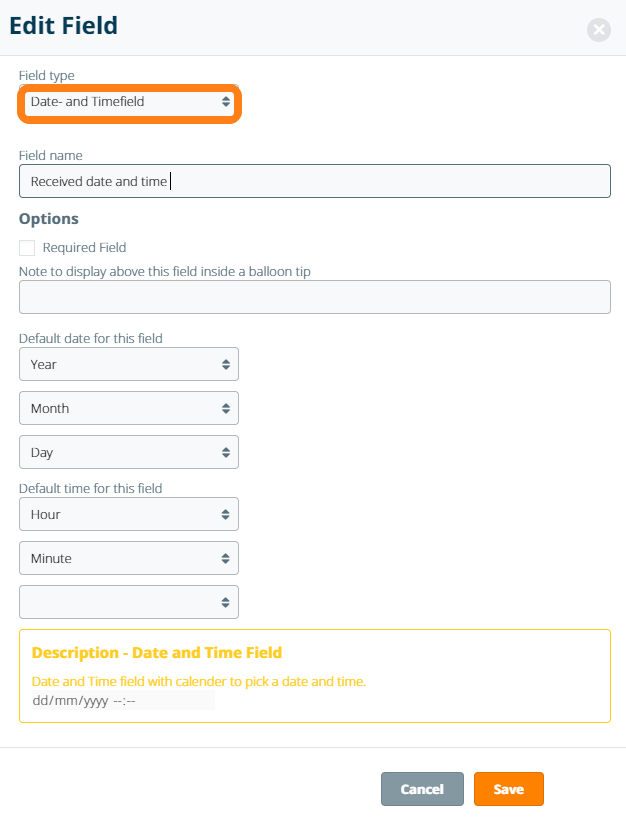To add a field that allows you to select a date and time, choose Date and Time Field from the Field type dropdown.