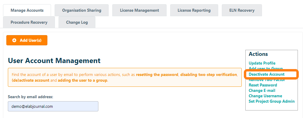 The account is deactivated and this user is now blocked and the user with this account is now blocked to log in to the system. Note that for deactivated users, no license costs are charged and deactivated users are not counted in the license plan of the eLabInventory Private Cloud or On-Premise installation.