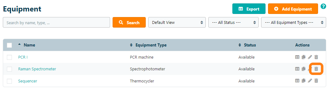Equipment Deleting Equipment To delete a device from the lab that is no longer used, browse to Configuration – Equipment and select the device from the list and click Delete. Note that deleted devices are no longer available and can not be recovered from the archive.