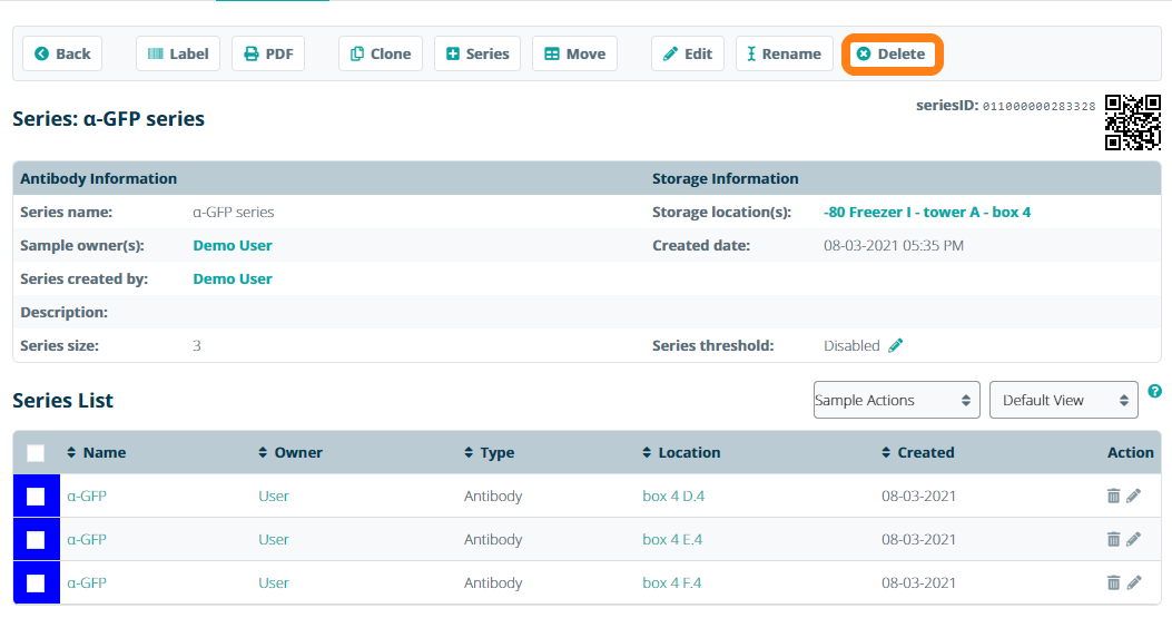 To remove a sample series from your inventory, you can either delete all of the individual samples or remove the series. Open the samples series information sheet and click Delete. Note that all actions in the top action menu are performed on all samples in the series. To perform actions of a part of the samples in the sample series, use the checkboxes and select the action in the Sample Actions drop-down menu.
