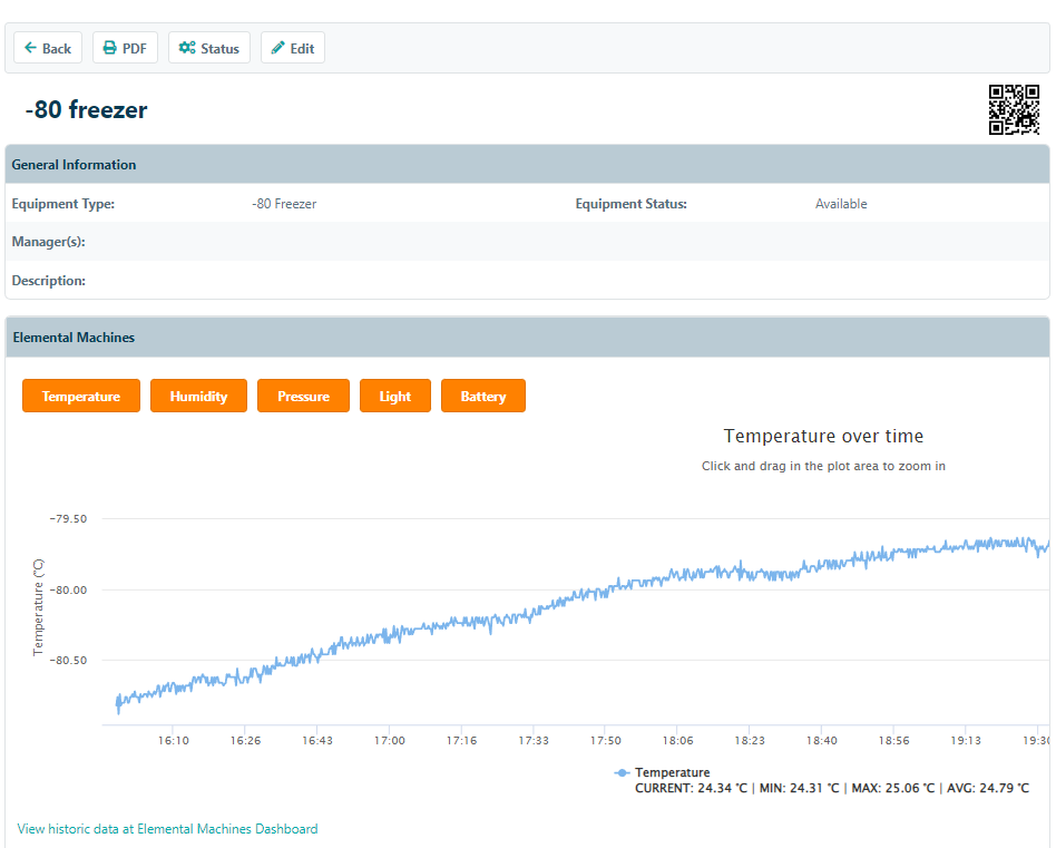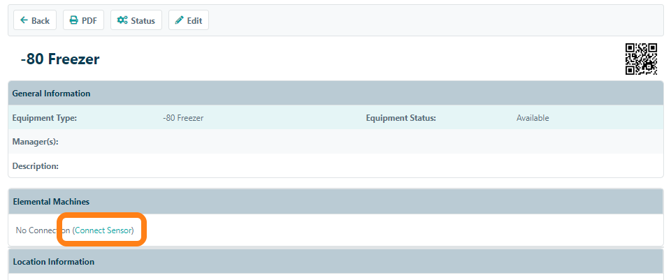 To connect a sensor to your device in eLabInventory, navigate to the storage unit of equipment to view the device. On the device the Elemental Machine section is now available to connect the sensor.